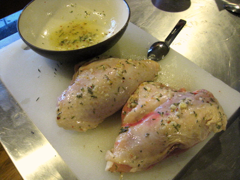 Transfer the paste to a bowl. Stir in the juice of 1 lemon and the olive oil. Add the chicken and turn to coat.