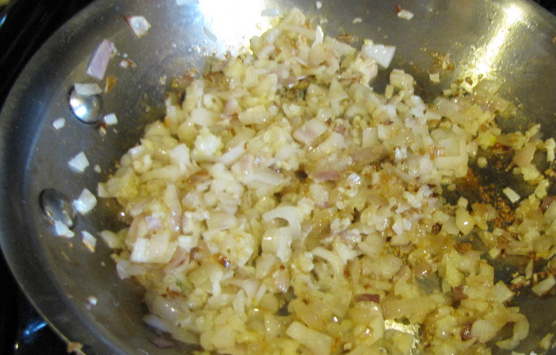 Heat a large saute pan over medium heat. Add olive oil and heat. Add garlic and shallots and cook for 4 minutes.