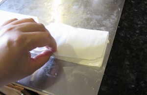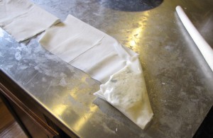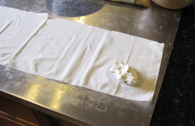 Preheat oven to 440 degrees F. Cover the phyllo dough with a damp towel. **NOTE: You may need to cut your phyllo sheets lengthwise, in which case you’d only need 5 sheets for each version. My phyllo, which I bought frozen, already came in lengthwise strips like I used in the photos below.