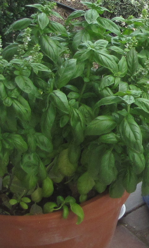 Here’s a crazy fast and delicious recipe for a Friday. Basil Pesto. Honestly, it takes 10 minutes to make and apparently keeps for an eternity. This was the 3rd sauce I made on Sauce Day last week. Unfortunately I don’t have any photos of this pesto on anything yet, so I’m limited to an unappealing photo of it still in the mixer bowl. I didn’t really think the photos for this one through. But I can tell you it is delicious. But instead of my usual “finished recipe” photo to start, here’s a picture of the abundance of basil I’ve got growing on my back steps. The stuff is growing like weeds, and it is delicious and incredible having it fresh whenever I want to cook with it. But it was starting to take over this flower pot, so I decided to cut down half of it and make a big patch of pesto.