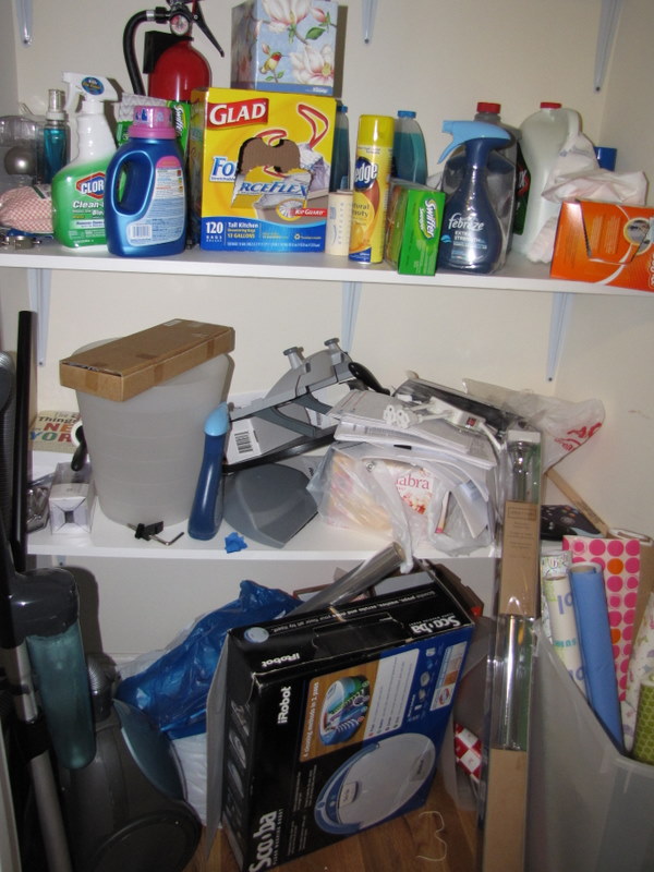 One of the most satisfying projects I did around the house this summer was cleaning out our laundry room closet. This closet was a serious disaster. See?