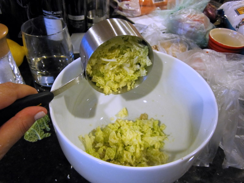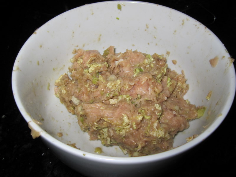 In a large bowl, knead the chicken with the cabbage, cilantro, lemongrass, chives, ginger, garlic and egg and salt.