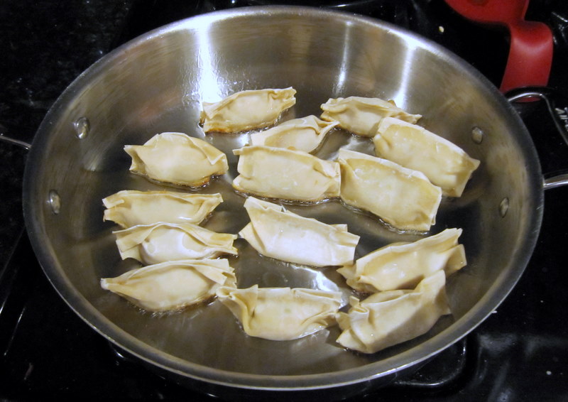 In a very large nonstick skillet, heat 2 tablespoons of the oil. Arrange half of the dumplings in the pan, pleated edge up. Cook over high heat until the bottoms are lightly browned, about 2 minutes.