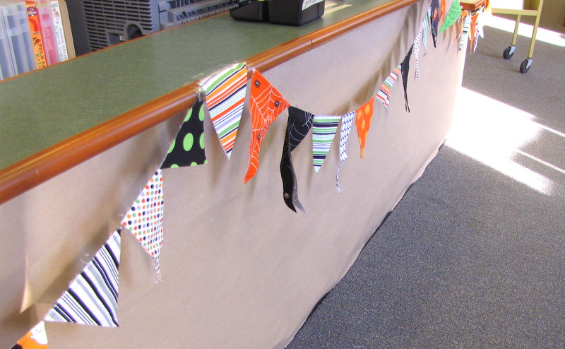 With the fabric I had left over I made bunting, some hanging from our porch and some from the circulation desk at school.
