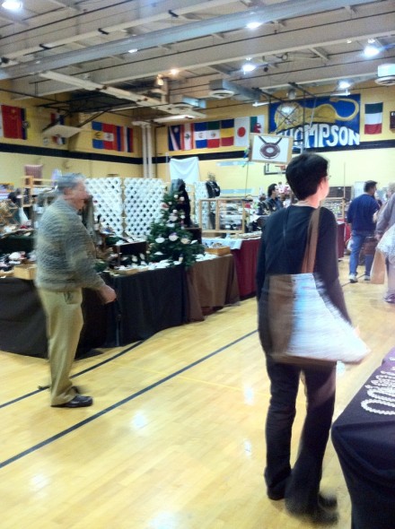 I went to Granny’s Attic today, a local craft show held in a middle school. This was the 30th year of the show, and it was pretty amazing. It took over the entire school. Desks were moved out of classrooms to make room for shops, teachers and parents sold raffle tickets and baked goods. I took this photo with my iPhone while shopping in the gym (where I bought a delicious candy apple covered in caramel, white chocolate, and golden Oreo crumbs). I picked up a couple of stocking stuffers. I bought raffle tickets to help support the school. It was a really warm, fun, unusual event. I loved it.