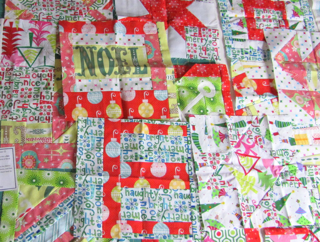 Remember my month for Bee Improvisational? I’ve had the blocks back for ages and haven’t done a thing with them. Until today, when we bought our Christmas tree. And I finally had to face the fact that if I was, in fact, going to make a tree skirt with these blocks I needed to get a move on. So I’ve sorted out the blocks, and now I’m going to attack them with some red sashing. I have so many blocks that I may make this one reversible, we’ll see. But here’s an idea of all the blocks I’ve got to work with.