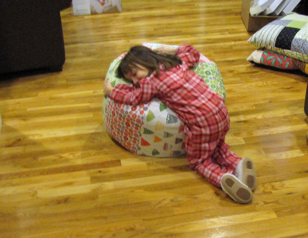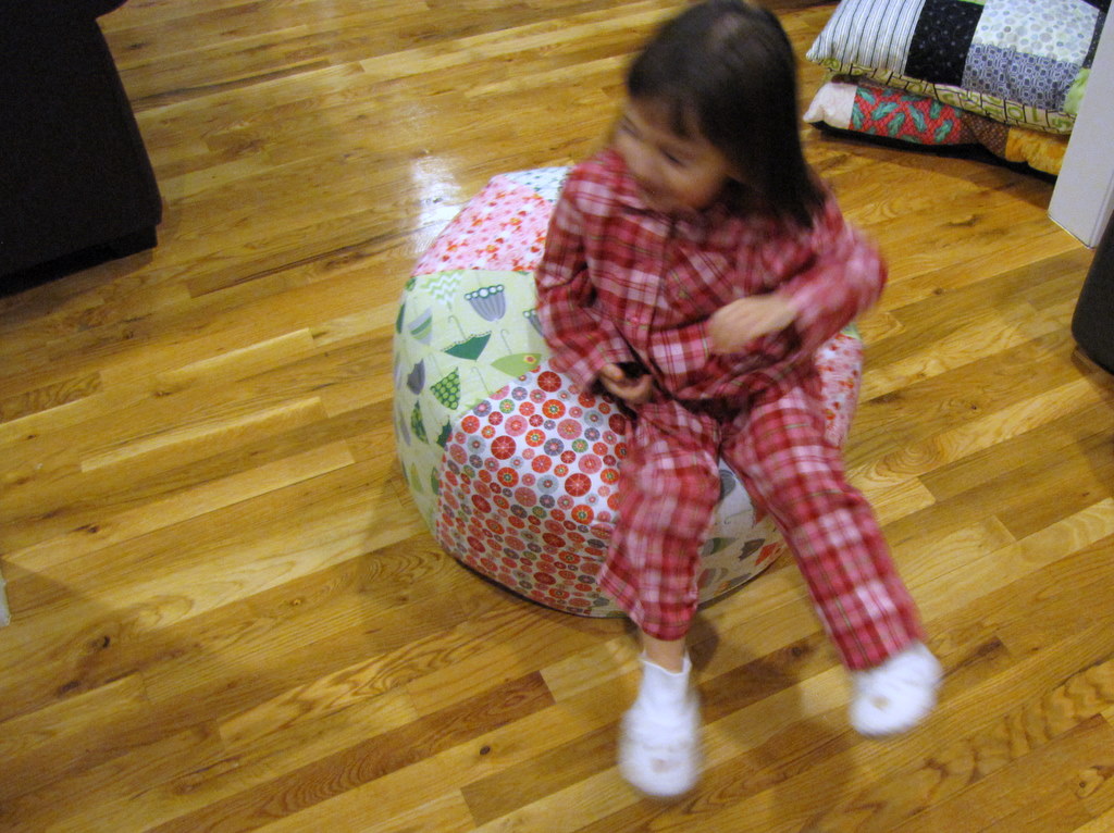 I made my niece Grace a “pouf” of her very own, another 24″ Amy Butler Gumdrop. She bounces on mine constantly when she’s over, and this summer she pulled all her favorite (pink) fabrics from my stash and said, “Make me one please, Aunt Jackie.” So I did, deciding to just use the Rainy Days and Mondays fabric from Riley Blake that I’ve been saving for a deserving project. From these photos, I would count this as entirely worthy.