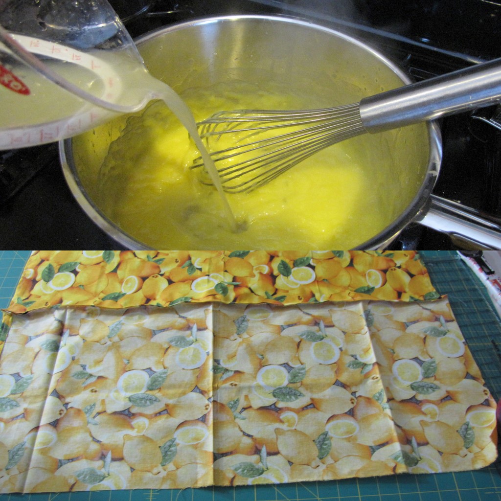 I used Martha’s Pate Brisee recipe for the crust (because it didn’t call for shortening), and America’s Test Kitchen Family Baking Book’s recipe for the filling and meringue. And I used 2 yards of lemon fabric from the Farmer’s Market collection from RJR fabrics, about 8′ of ribbon for the ties, white thread, and a length of yellow bias tape for the neck. I’ve tried to explain how I made the (completely improvised and certainly not by-the-book constructed) apron as we go along with the pie. Enjoy!