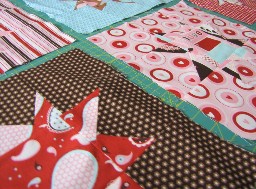 As soon as I saw the Love Nest collection by Carina Gardner, I had to have it. I almost held off sending my Pretty in Pink bee packages so I could use this fabric instead. But, in the end I decided I’d make some wonky stars with it and see where they take me here at home. I think they’re taking me to a Valentine’s Day table runner, but I’m not positive yet….