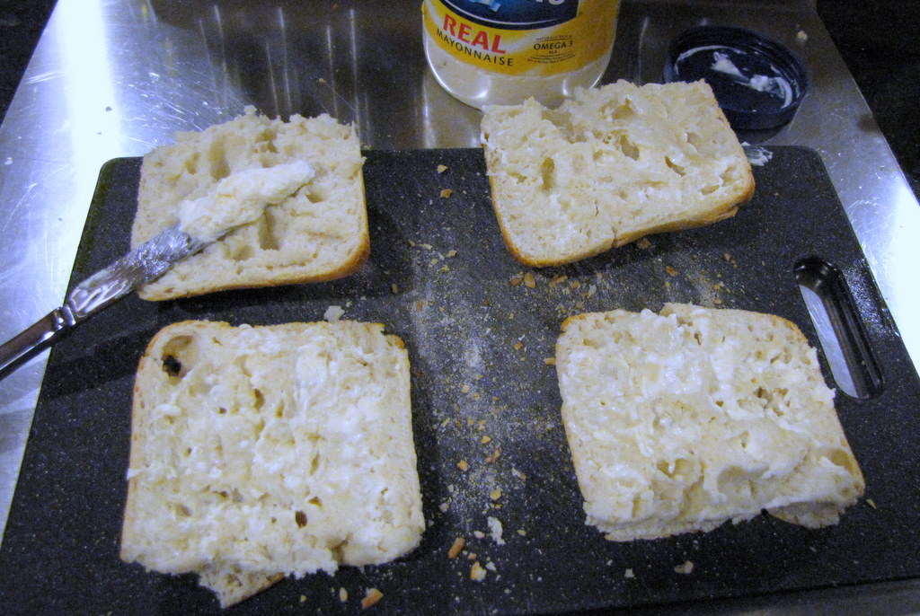 Cut the bread in half and split each half. Spread mayo on the inside of the bread.