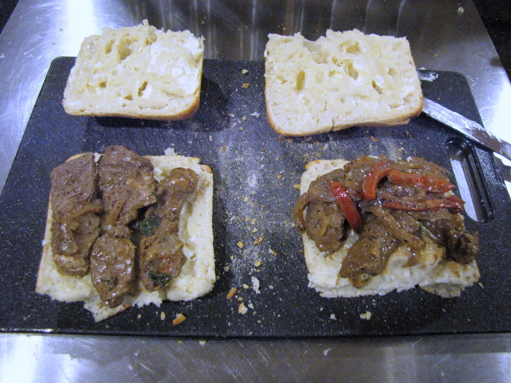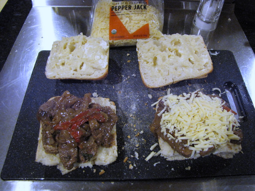 Spread a layer of cooked steak, onions, and peppers on top of the bread. You might want to heat up the steak in the microwave first, or you’ll need to put the sandwiches into the oven to cook through (like I did).