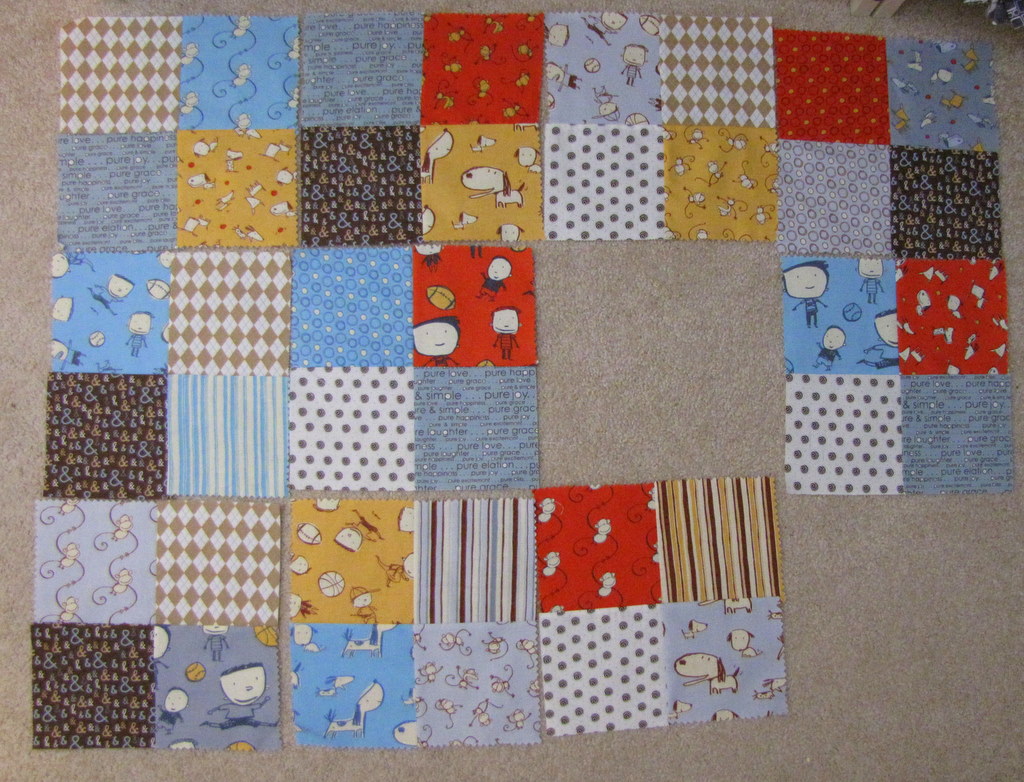 One of the teachers at school just had a baby boy. I was trying to get this quilt finished for her in time for her shower a few weeks ago, but I ended up being home several days the week of the party. So I decided to give myself until this past Friday, her last day before maternity leave, to finish it and give it to her. Then she went into labor and had the baby on Monday night. So now, I’m just trying to finish it and mail it to her.