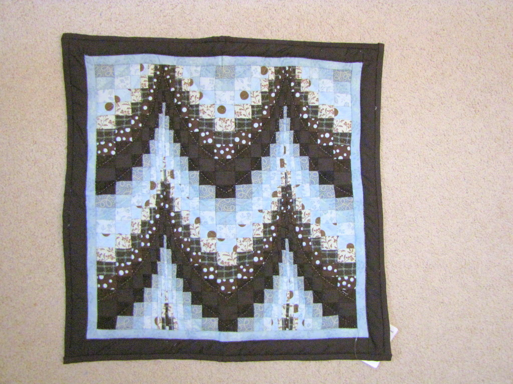 This is the bargello quilt I bought at Log Cabin Quilts. I love it, and it’s small. Maybe 18″ x18″. I think I’ll hang it in the dining room.