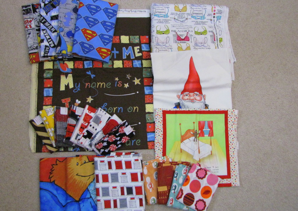 I think this is hands-down the strangest assortment of fabrics I’ve ever arrived home with. Gnomes, bras, Superman, Batman, spaceships, Paddington Bear, thread spools, funky monkeys, and a fabric baby chart. Craziest haul ever.