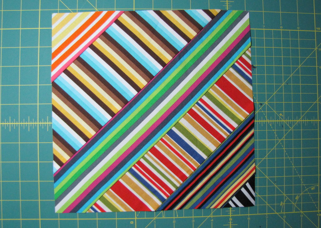 I’m kind of in love with the square block. I just threw some stripes from my stash together and cut it out on the diagonal. And it looks very cool. For the rectangular block I did kind of a string block take on stripes, cutting 1″ strips of stash fabric and sewing it together until I got the right dimensions.