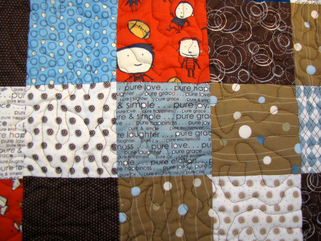 I have finished the quilting on this one, now I just need to snip threads and bind it. This is the first time I’ve played with the Bernina Stitch Regulator, and I love it. Took a while to get a groove going, but once I did it was great. I just did a meandering quilt pattern all over in chocolate brown thread.