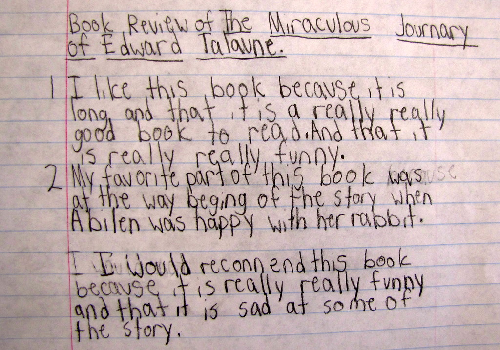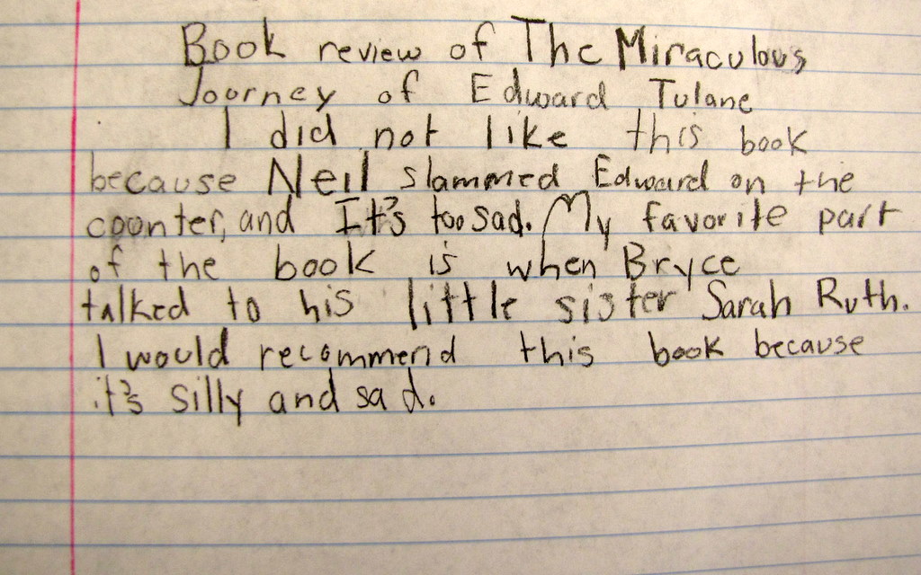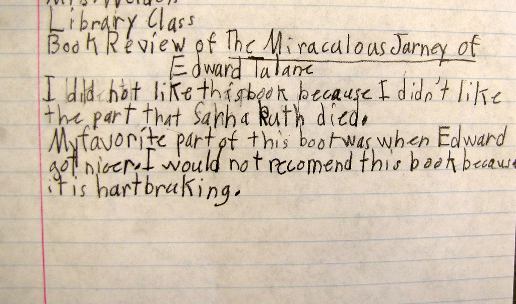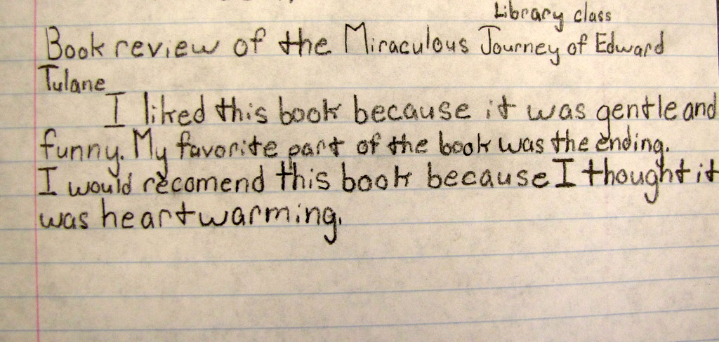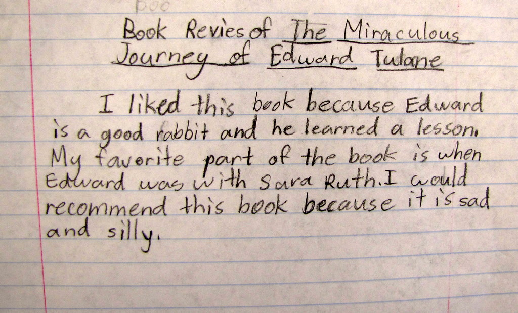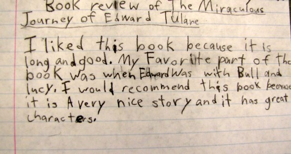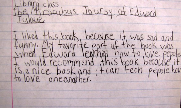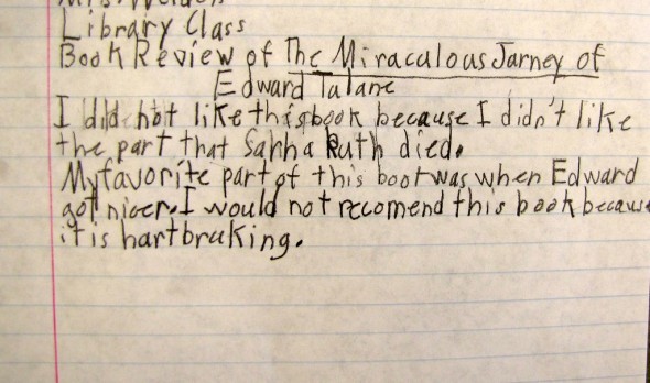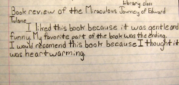 I’m so excited, all the 2nd grade classes are now done with The Miraculous Journey of Edward Tulane. We’re finishing up book reviews of it this week. I wrote 3 sentences on the board and asked the kids to fill in their opinions, good or bad, of the book. They had some great thoughts about it, I was so impressed! I used to take it personally when students didn’t like a book we read in class together, but then I remembered that I don’t like every book I’ve read, either. Especially those I read in school, so why should I expect them to be any different? The point for me is that they really think it through, I don’t want them to just tell me it was good or bad. And they totally get it.