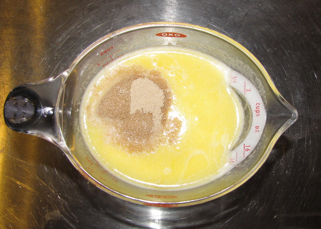 In large measuring cup, mix together milk, water, melted butter, sugar, and yeast.