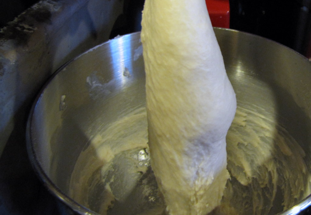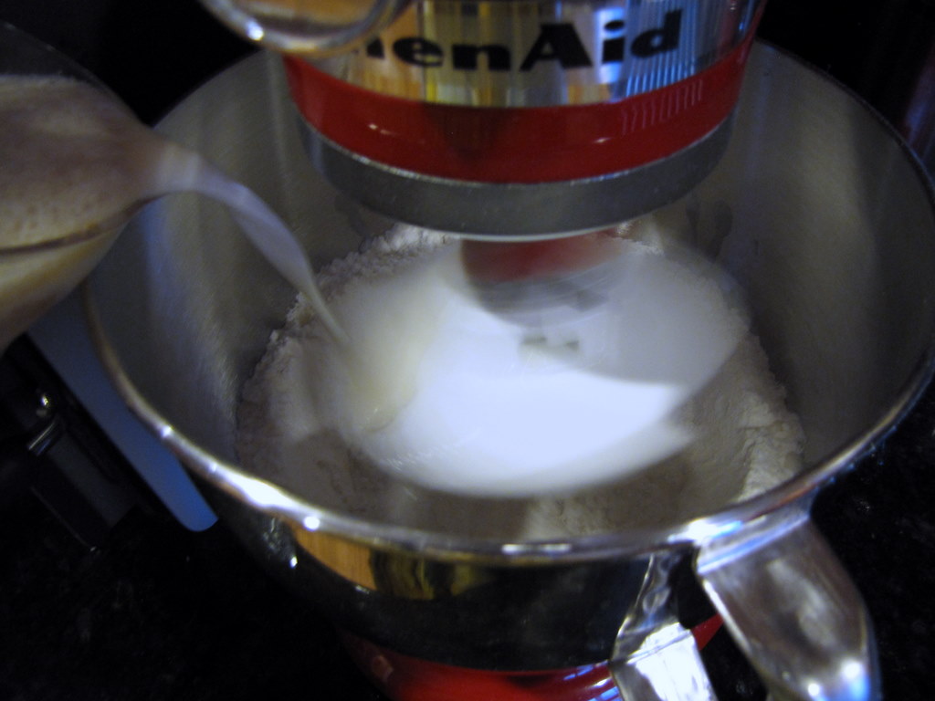 Mix flour and salt in standing mixer fitted with dough hook, (see below for making Monkey Bread without a mixer). Turn machine to low and slowly add milk mixture.