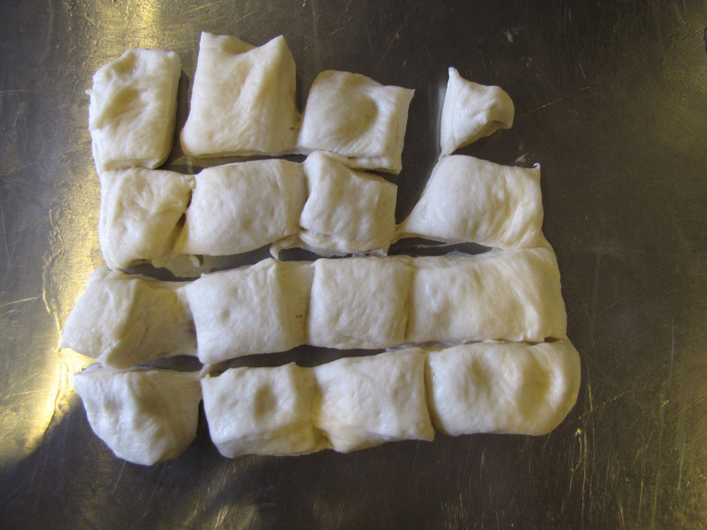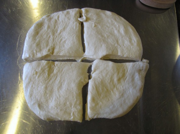 Gently remove dough from bowl, and pat into rough 8-inch square. Using bench scraper or knife, cut dough quarters.