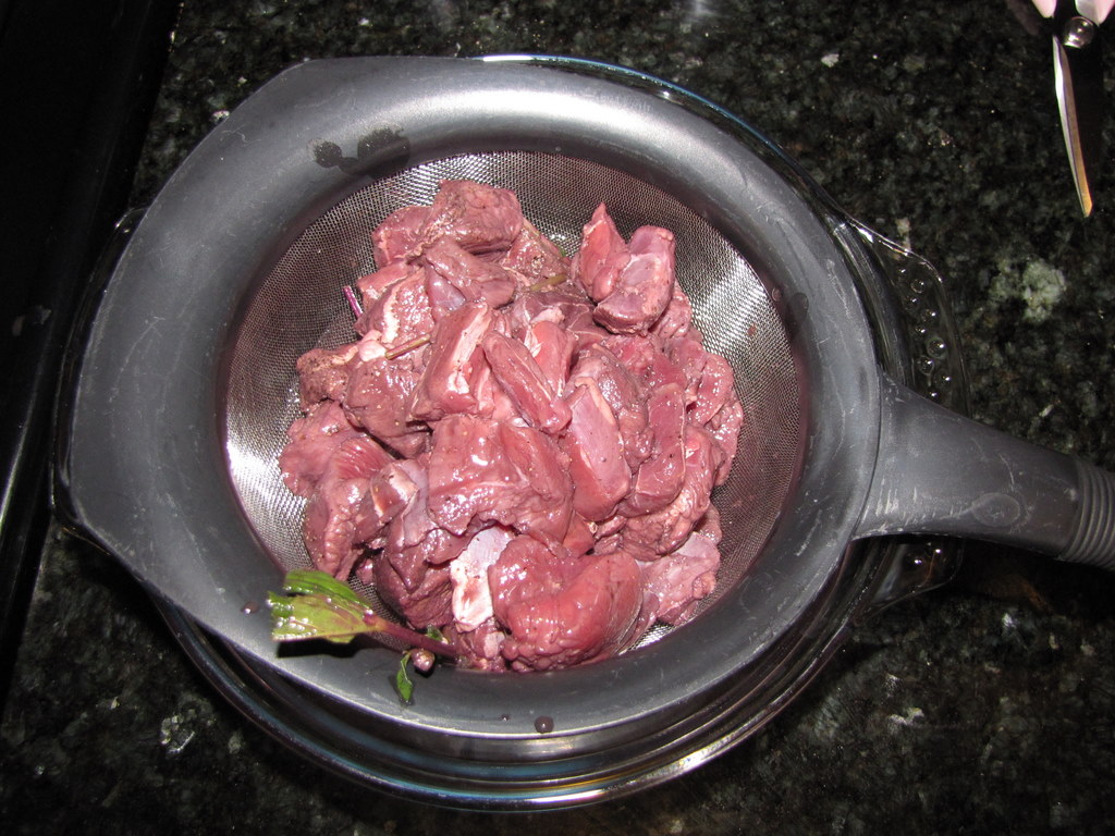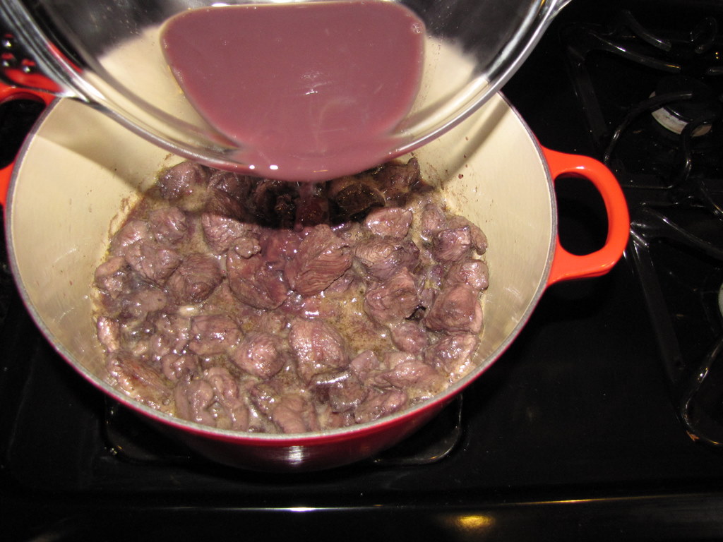 Return all of the meat to the casserole. Add the marinade and bring to a boil.
