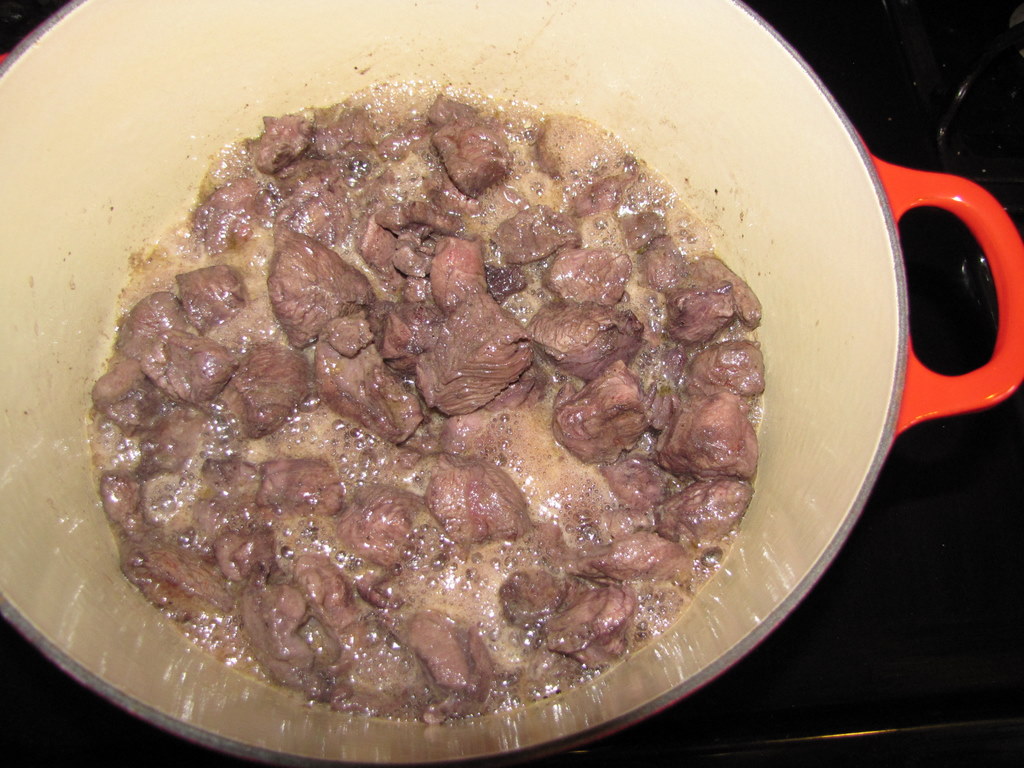 Pat the beef dry. In a large enameled cast-iron casserole, heat 2 tablespoons of the olive oil. Add half of the meat to the casserole and cook over moderately high heat, turning occasionally, until well browned all over, about 12 minutes.