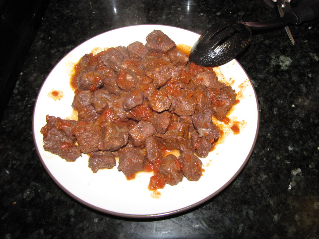 This was so savory and delicious, but preparing the meat for this was one of the more intense things I’ve done in the kitchen. I wanted to try it because I remember Chris Cosentino from The Next Iron Chef, and this was an adaptation of one of his recipes. I’ve never worked with beef shanks before, and I couldn’t find the boneless shanks the recipe suggested. So I bought bone-in shanks, just an extra pound to get enough meat. And I’ve now learned that they are extremely messy to get off of the bone and trim. The membrane around the shank is not pleasant, and it took me almost an hour just to do that. But once I had the meat off the bone and trimmed, it was all good. Really good.