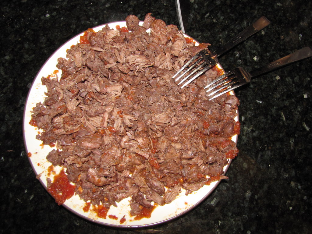 Using a slotted spoon, transfer the meat to a plate and shred with 2 forks.