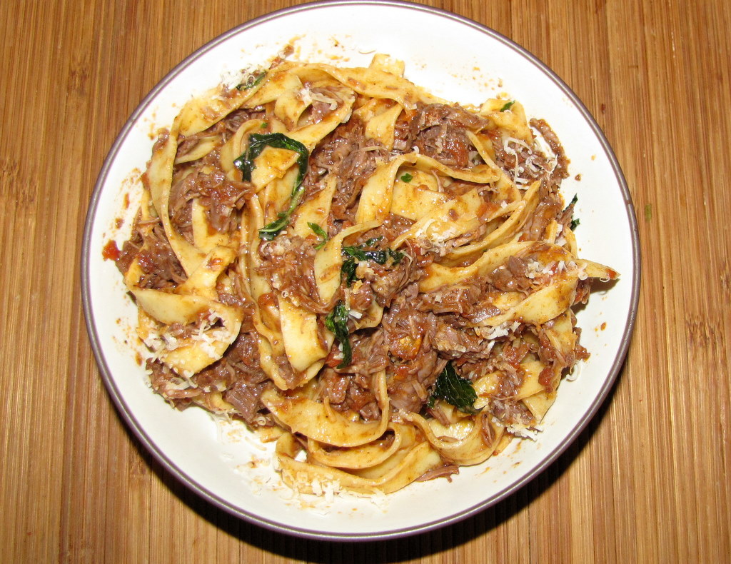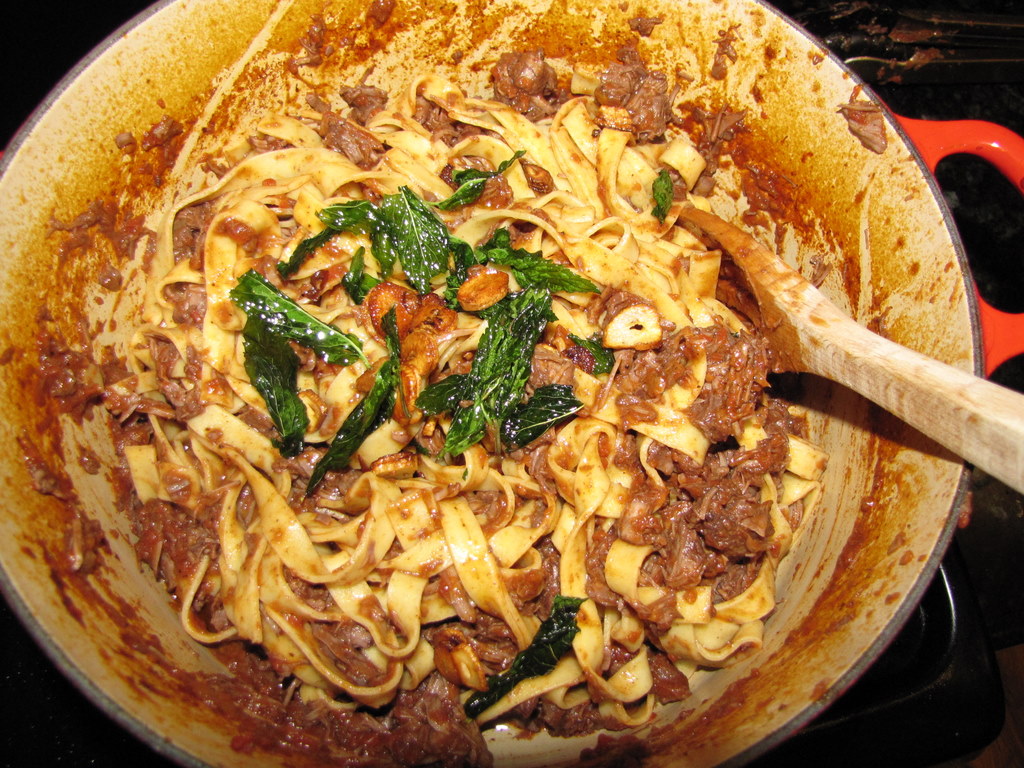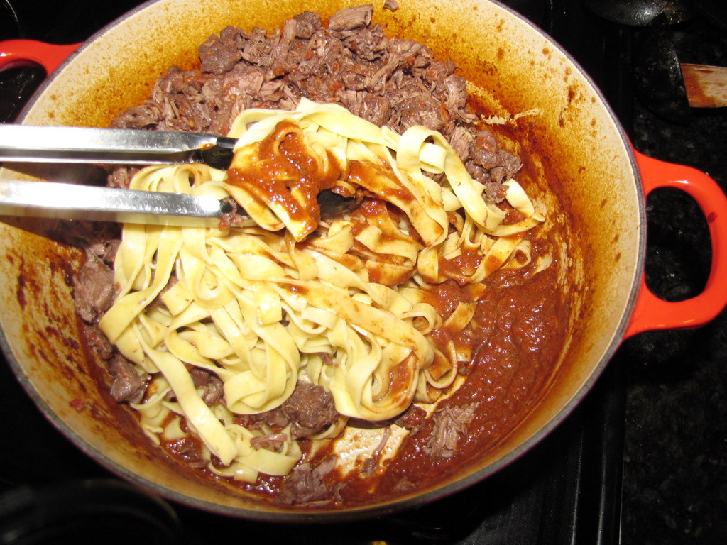 Meanwhile, in a large pot of salted boiling water, cook the pappardelle (I could only find fresh fettucine) until al dente. Drain and return the pasta to the pot. Add the meat and the reduced braising liquid and cook over moderate heat, stirring, until the pasta is well coated with the brasato, about 2 minutes.