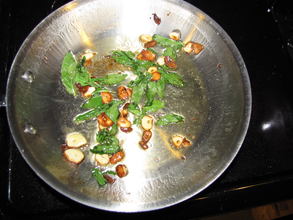 In a small skillet, heat the remaining 2 tablespoons of olive oil until shimmering. Add the garlic and cook until lightly golden, about 1 minute. Add the mint leaves and cook for 10 seconds.