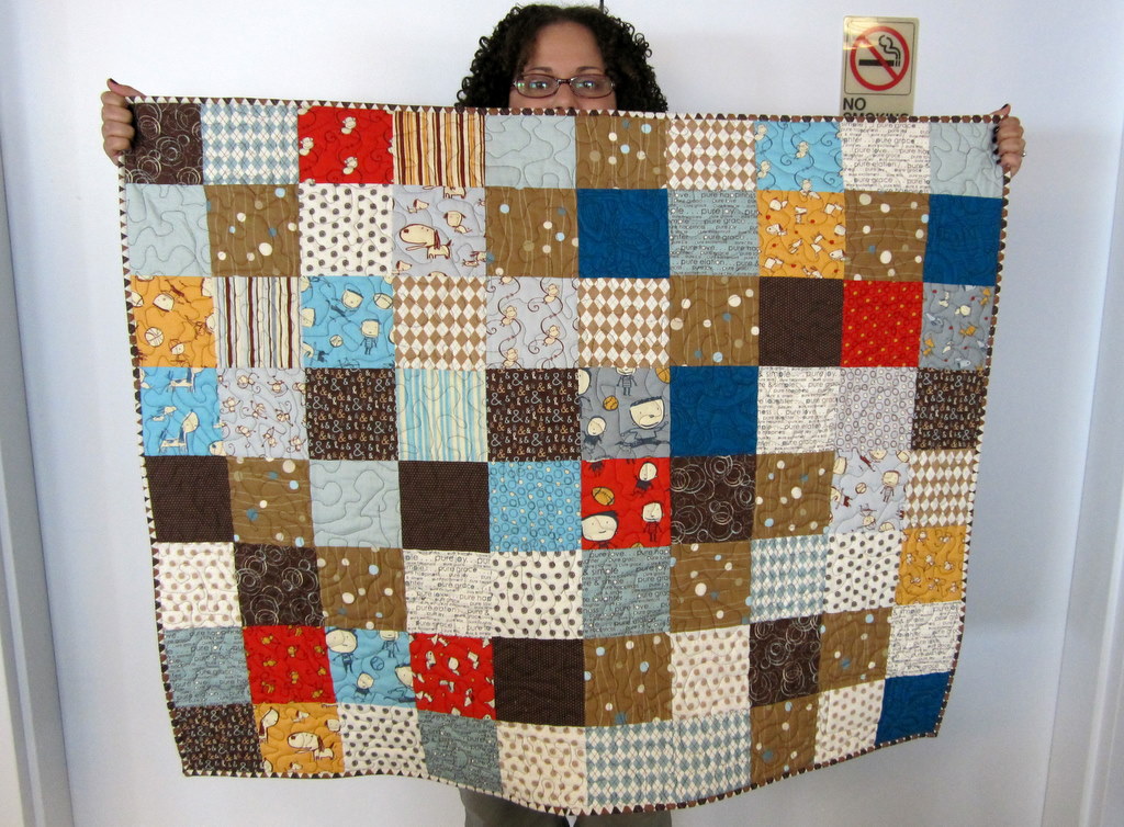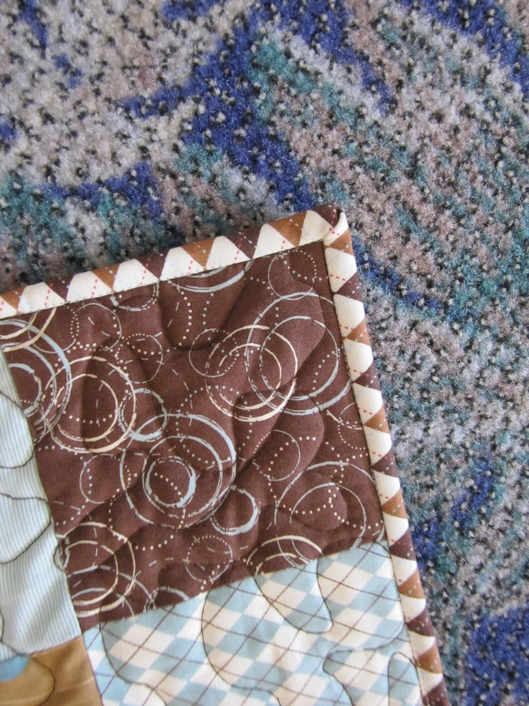 I took it with me last weekend to a BBQ retreat with my mom and Aunt Jackie, and all that was left to finish was the binding. More on that interesting weekend later, but I used some argyle yardage from the Moda Pure collection (which is also sprinkled around this quilt). I made the binding there and sewed it on, and I think this looks great. Definitely the most interesting baby quilt I’ve made.