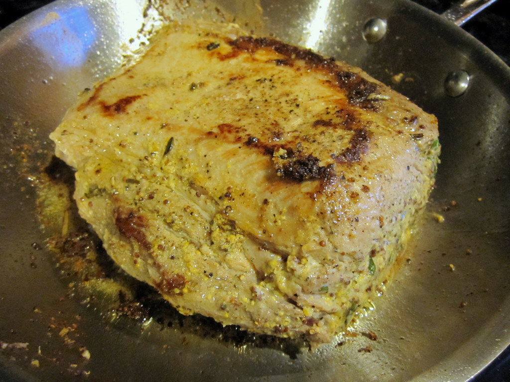 In a small bowl, whisk the Dijon and whole-grain mustards with the grated lemon zest, thyme and butter. Set 2 tablespoons of the mustard mixture aside. Season the pork with salt and pepper and spread the rest of the mustard mixture all over it. Let stand at room temperature for 2 hours or refrigerate overnight.