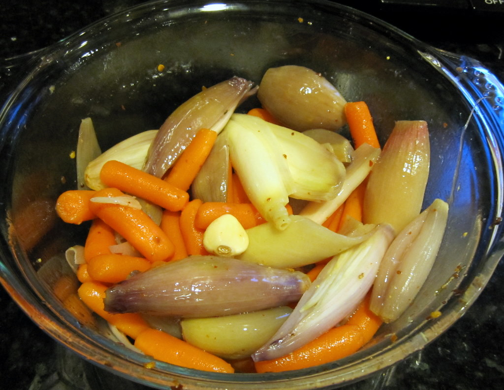 Drain and halve the shallots lengthwise and add to the carrots. Add the wine, garlic, crushed red pepper, 1/4 cup of the stock and 1 tablespoon of the olive oil to the vegetables and toss well.