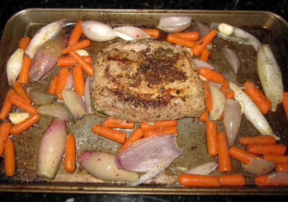 Spread the vegetables around the edge of a shallow roasting pan, setting the shallots cut sides down. Leave enough room in the center for the pork.