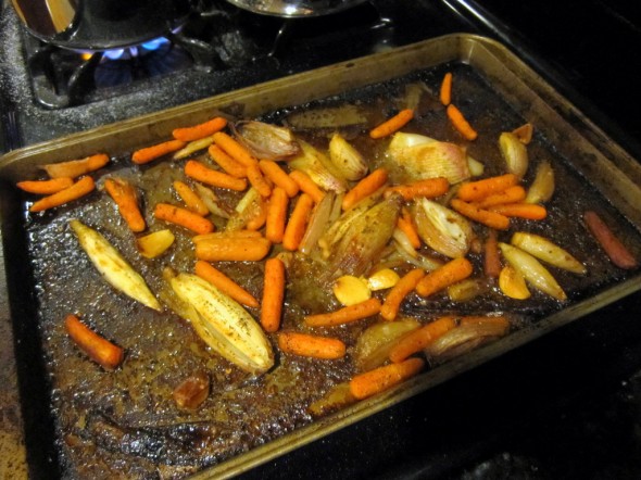 Transfer the pork to a board. Roast the vegetables on the bottom shelf for 15 minutes longer, until very tender.