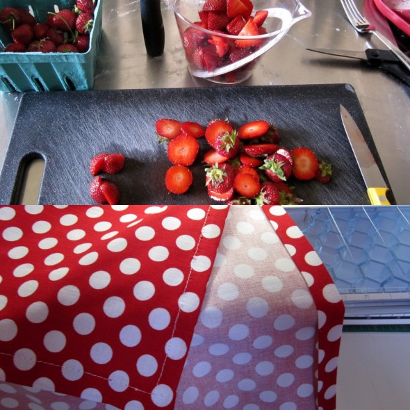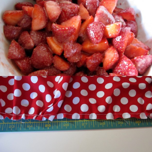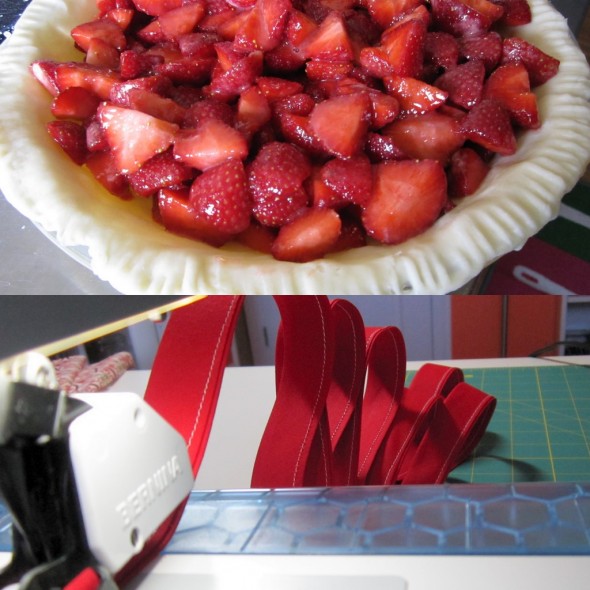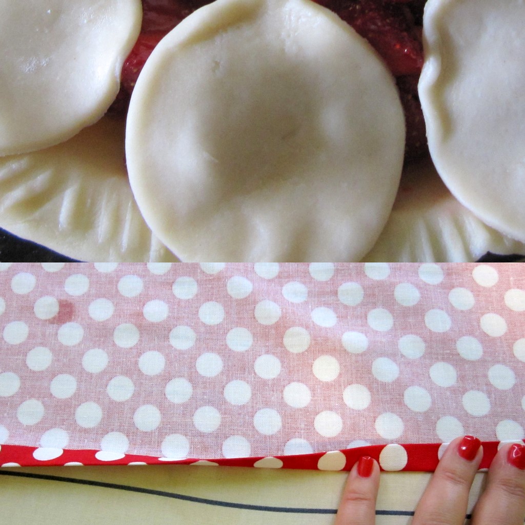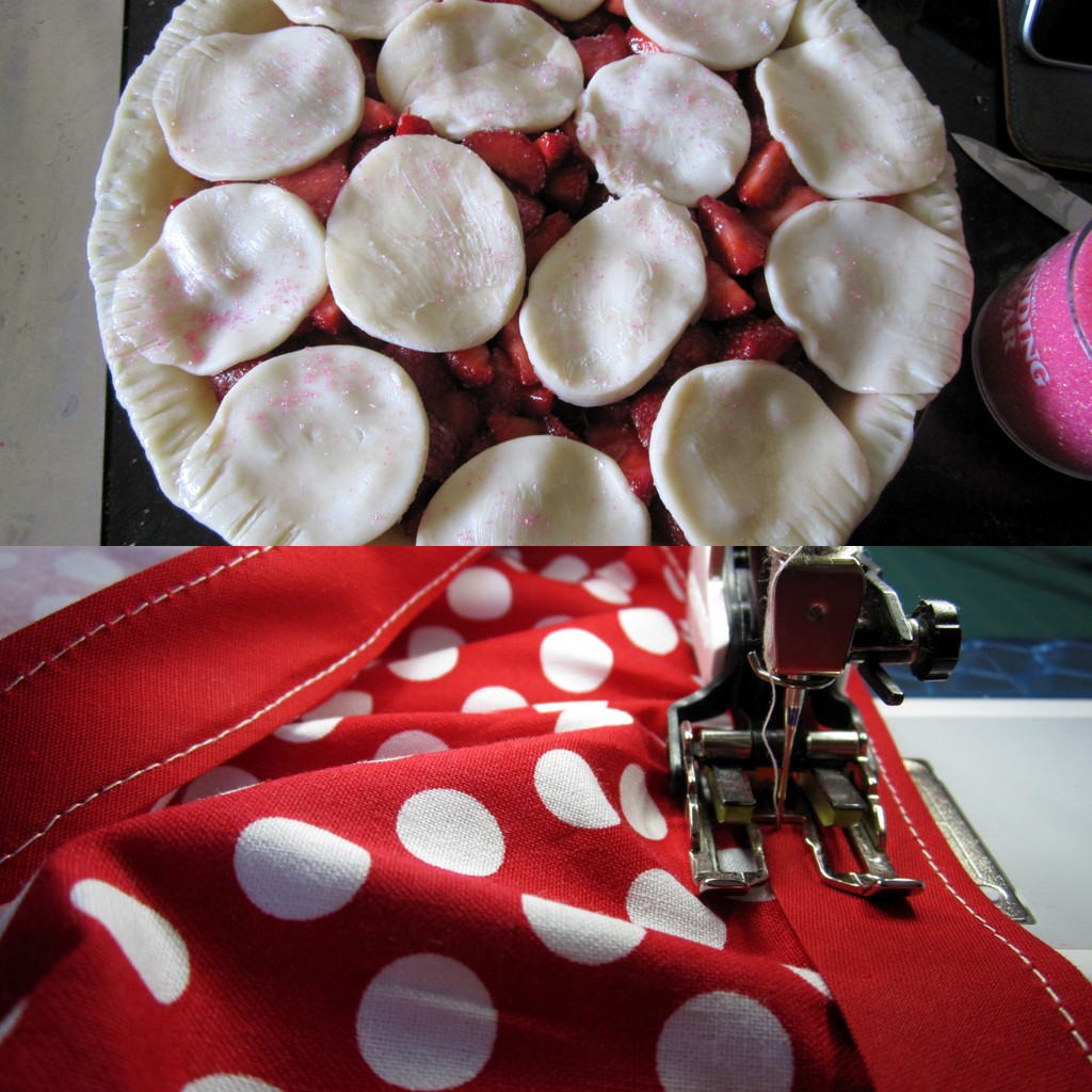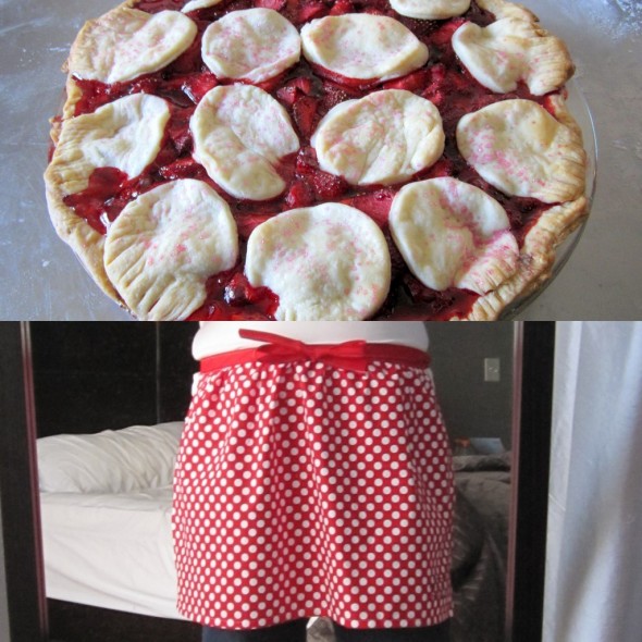 I used a recipe from The Neelys for the pie, which was so easy I cannot stand how many fruit pie variations I will be making this summer. I suddenly understand pie in the summer. And the half cafe apron is something I just whipped up in less than an hour with some fun red Michael Miller polka dots.