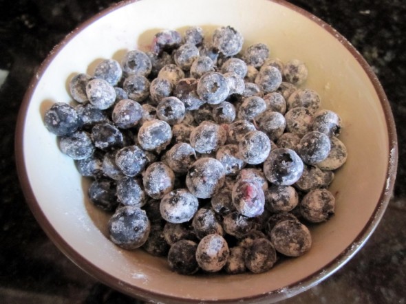 Adjust an oven rack to the middle position and heat the oven to 375 F. Grease a 12-cup muffin tin (Usually I paper, but I don’t like papers on my muffins). To keep the blueberries from sinking to the bottom of your muffins or turning them blue, toss them in a bowl with 1 Tbsp of flour.
