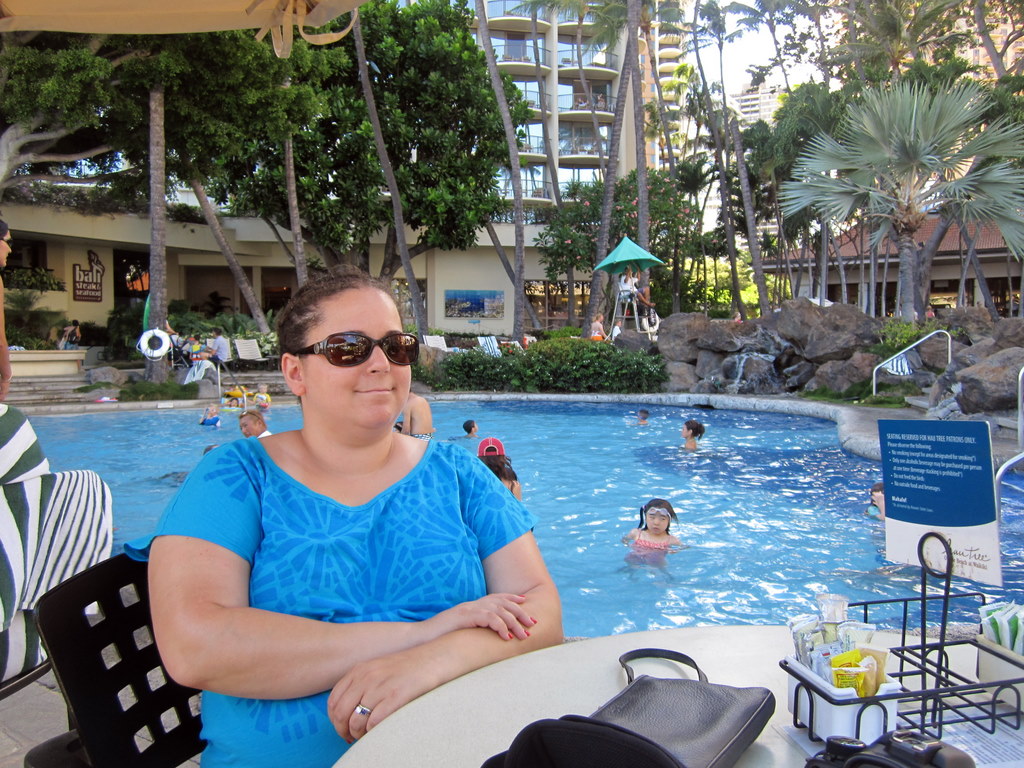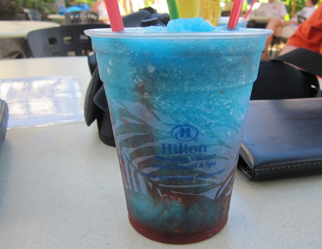 Sitting at the Hau Tree Bar at the Hilton Hawaiian Village. This is Danno and co.’s favorite barm their table is off to the left. Yes, of course I asked which table (it was already full). Adam had a “Hawaii 5-0” cocktail and I had the “Book ’em Danno!” nonalcoholic cocktail. It was diabolically awful, but that’s not why we came here.