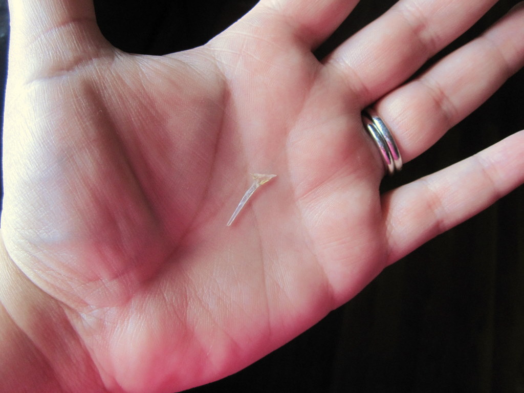 The bone was like this one, but with a longer hook at the end. And it was solid white, I have no idea how on earth I managed to miss it while eating. We were expecting a tiny bone fragment, but instead out came this mini shark tooth.