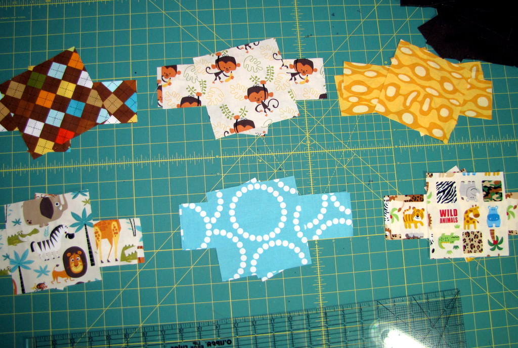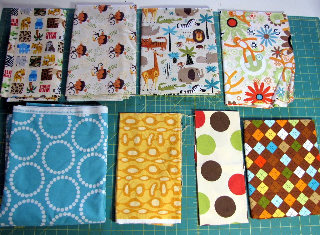 Last year I made this quilt for a friend of mine going through quite a tragedy. This year she is pregnant again, expecting a baby boy in September! She has a Masters in anthrolopology and has spent time in Borneo and Costa Rica studying primates and various other species. So a jungle-themed baby quilt seemed entirely necessary. These are the fabrics I originally picked to work with: