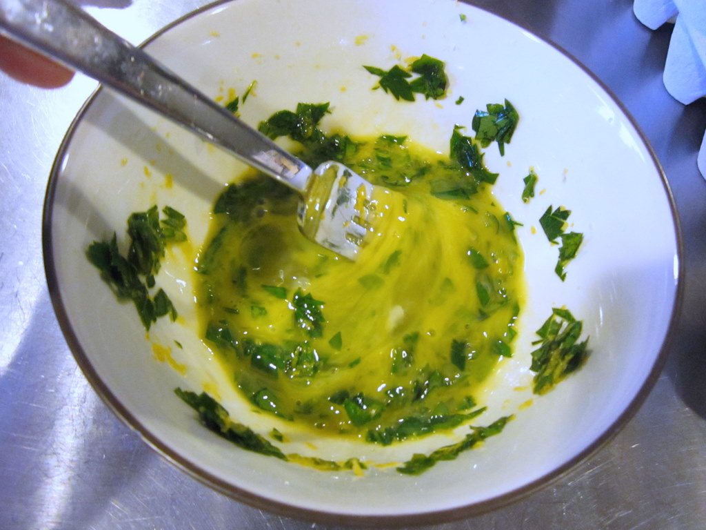 Place a baking sheet upside down in the oven and preheat to 400 degrees F. Beat the eggs, parsley and lemon zest in a small bowl.