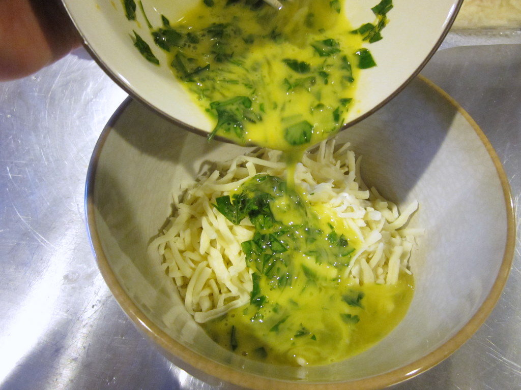 Pour half of the egg mixture into a medium bowl and stir in the mozzarella.