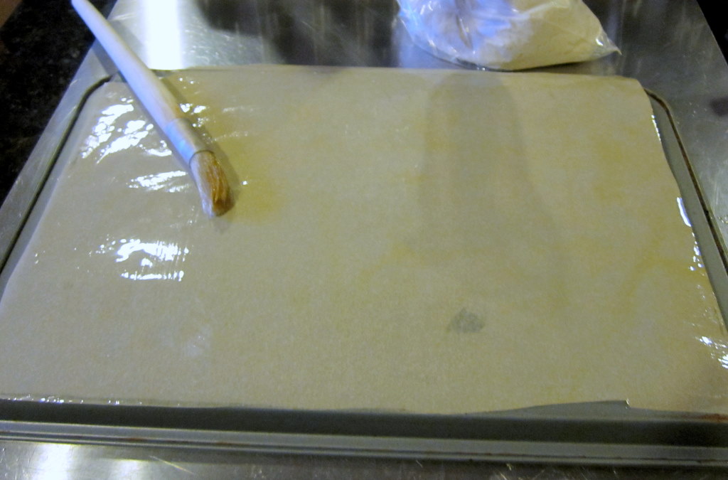 Turn another baking sheet upside down; line with parchment paper and brush with olive oil.