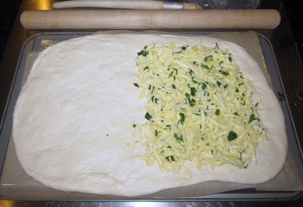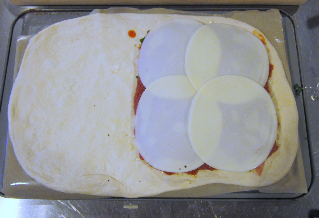 Spread the mozzarella mixture over one half of the dough, leaving a 1-inch border along the edge.