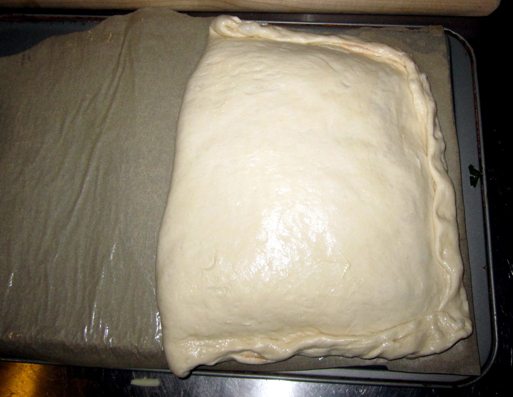 Fold the other half of the dough over to cover the filling. Crimp and roll the edges to seal, then pierce the top of the dough in a few places with a knife.