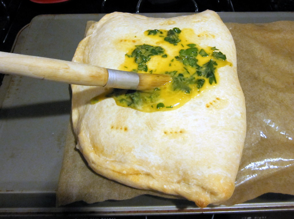 Slide the calzone with the parchment paper onto the hot baking sheet; bake 15 minutes. Remove from the oven and brush with the remaining egg mixture.