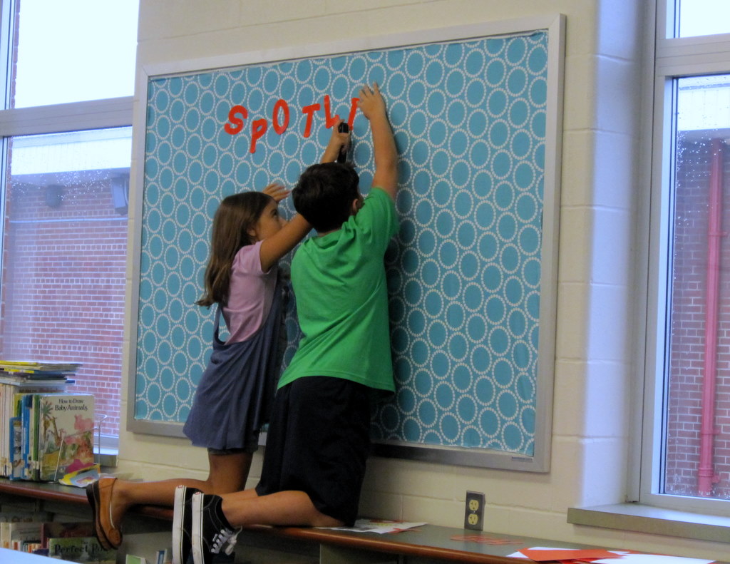 A lot of my bulletin boards and displays still needed to be finished, and since I can no longer easily/safely scramble on top of my bookcases like I normally would, I saved them for this week so the older kids could help. They’re so helpful, I love it. The 3rd and 4th grade classes took my “Spotlight On” bulletin board from this: