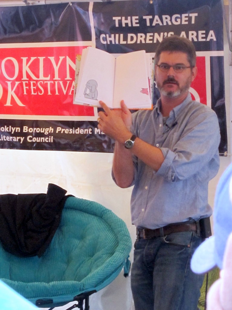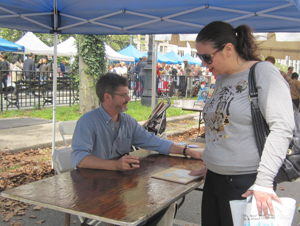 I bought Don’t Let the Pigeon Drive the Bus! and Knuffle Bunny from Bank St. Bookstore’s outpost at the festival, and Mr. Willems signed them both for Baby Reeve! I geeked out just ever so slightly, muttering about being a pregnant children’s librarian and a big fan. It was enough to sustain for me years, these first signed books in the baby’s library. Kathy got a copy of Don’t Let the Pigeon Drive the Bus signed for her mom, Annie, who is another fabulous children’s literature fan.
