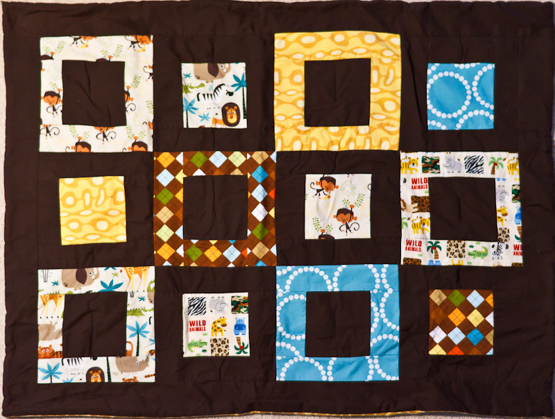 In the end, I decided not to add a border to this quilt. So I sewed it together like most of the other baby quilts I’ve made, stitching it closed at the end. Then I did simple straight stitch lines in various places to quilt it together. Simple, cotton batting in the middle. I think it came out really well.