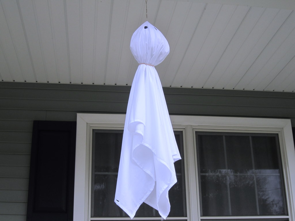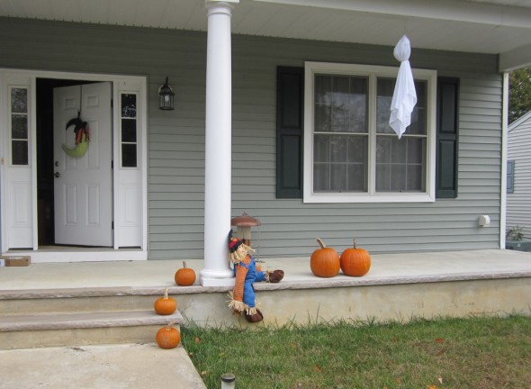 I made a Morley ghost for the front porch this weekend. When I was a kid we always made a Morley and hung him from the tree next to our apartment. I have no idea why he’s called Morley, I think it was an idea my mom found in a magazine and they named him Morley. But regardless, he’s been a part of my family in one way or another since I was knee high to a grasshopper. And he joined the pumpkins and the new scarecrow I got.